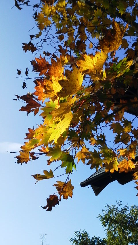 今日も快晴の朝日に紅葉が映える、いい天気。