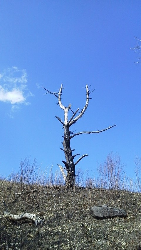 野焼きで焼けた木が、まるでオブジェのようでした。
